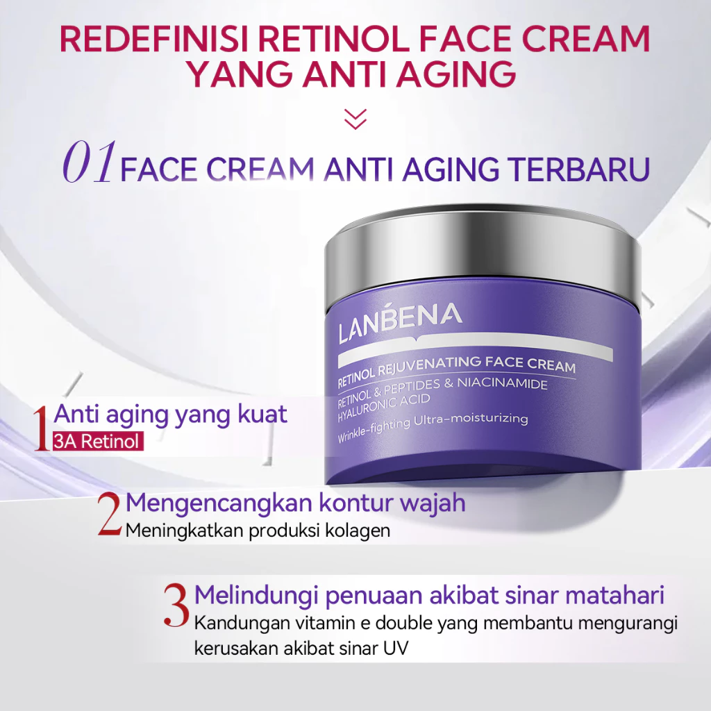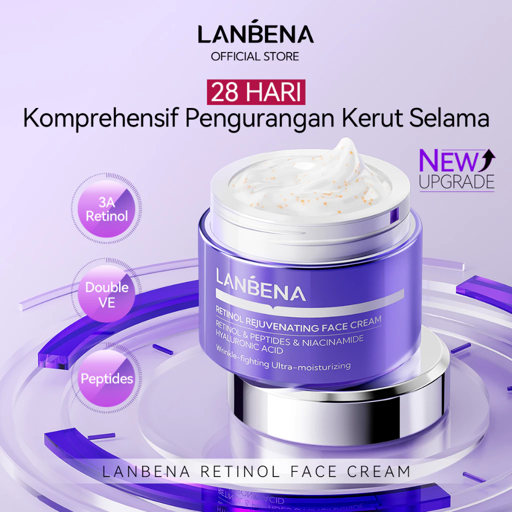 Moisturizer yang mengurangi kerutan di seluruh wajah dalam 28 hari tersedia dalam produk Lanbena 3A Retinol Renewal Anti-ageing Cream Moisturizer. Anti-ageing cream yang lebih kuat melawan kerutan dan melakukan peremajaan baru.
