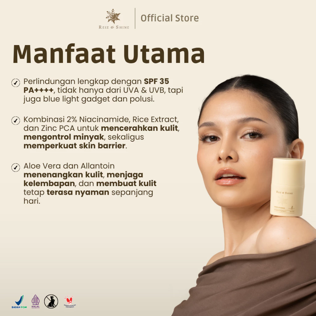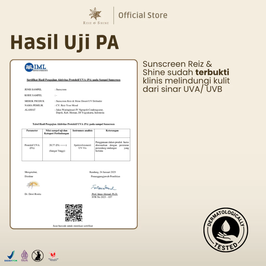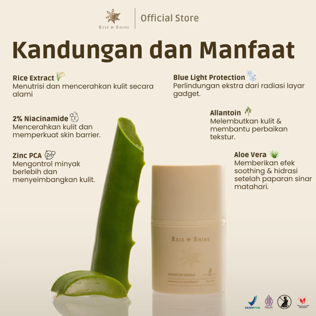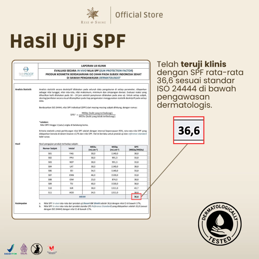 Reiz & Shine Desert UV Shield SPF 35 PA++++ adalah chemical sunscreen dengan proteksi lengkap—UVA, UVB, hingga blue light dari gadget. Formulanya bukan cuma melindungi, tapi juga mencerahkan, menenangkan, mengontrol minyak, dan menjaga kelembapan kulit tanpa white cast sama sekali. Teksturnya super ringan, cepat meresap, dan nyaman banget dipakai sebelum makeup.