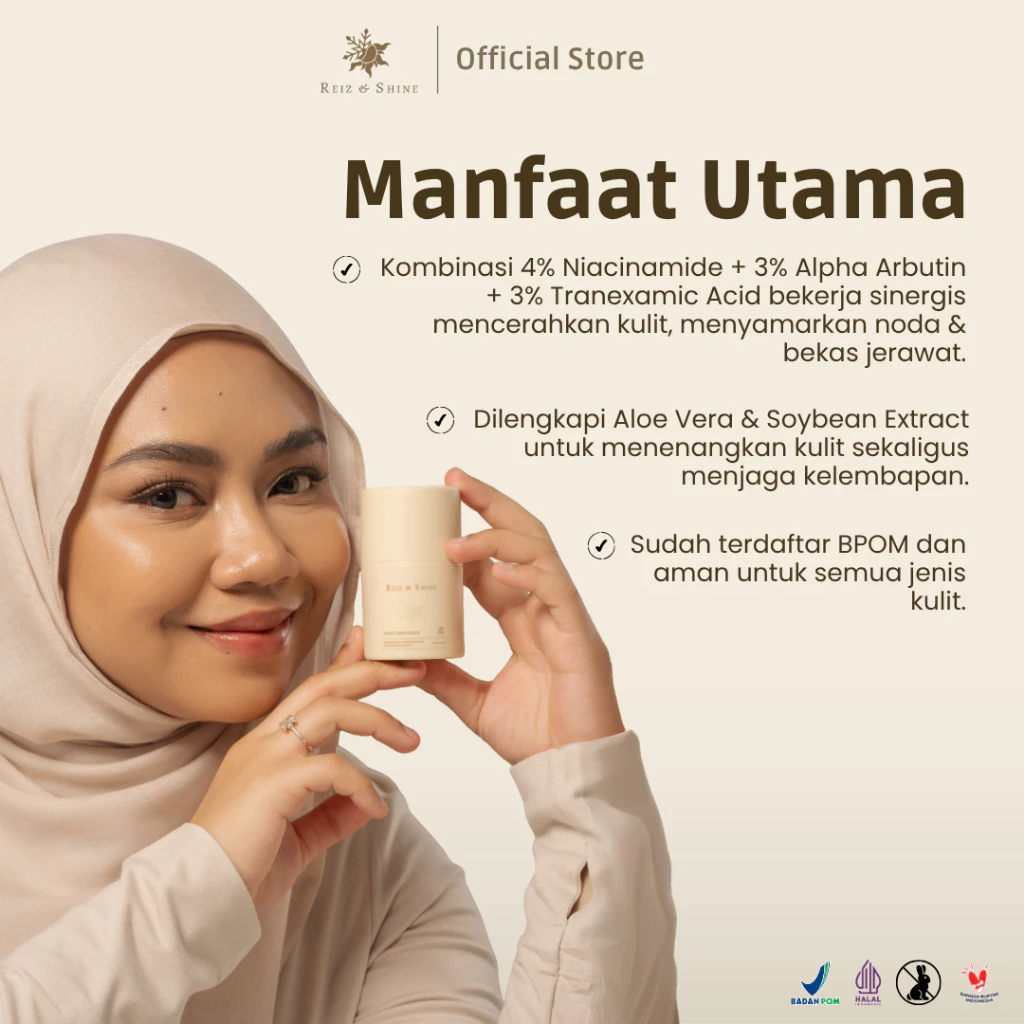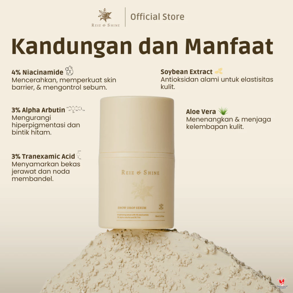 Reiz And Shine Snow Drop Serum menawarkan solusi cerdas untuk kulit cerah dan terhidrasi dengan manfaat ganda: brightening dan hydration. Serum ini memadukan kekuatan Triple Brightening Power dari 4% Niacinamide, 3% Alpha Arbutin, dan 3% Tranexamic Acid yang bekerja bersama untuk mencerahkan kulit kusam dan membantu menyamarkan noda serta bekas jerawat. Hasilnya, kulit tampak lebih bersinar, halus, dan merata.
